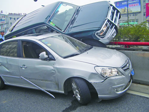 昨天清晨,杭州艮秋立交上面,發(fā)生了一起車禍,一輛“獵豹”爬到了立交橋的護欄上,左前輪懸在半空,獵豹下面還壓著一輛銀色的現(xiàn)代小轎車。
