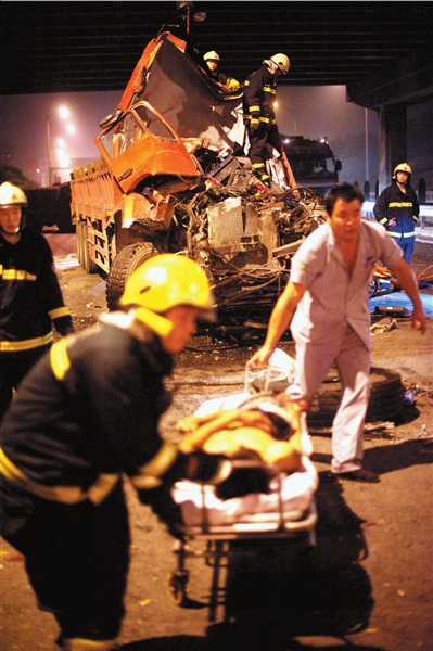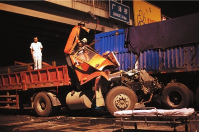 據(jù)貨車司機(jī)劉先生介紹,昨天凌晨2點(diǎn)左右,他的大貨車停在廣澤橋下等候通過,“就聽見后面有"轟轟"的車聲,隨后"咚"的一聲響,我的車被撞,向前沖了十幾米,又撞了前車,然后前面又有8輛車被撞——10車連環(huán)追尾,整個過程不到半分鐘”。從后面撞過來的是一輛運(yùn)載鋼材的紅色大貨車,車頭有些部位已嵌進(jìn)他的貨車的尾部,該車司機(jī)也被困在駕駛室內(nèi)。