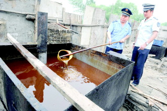 圖為工商執(zhí)法人員查出的地溝油小作坊。