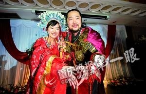 身著盛裝的美麗公主,在《皇上登基》的音樂聲中,與身高七尺、滿身鎧甲的帥氣“將軍”牽手走進(jìn)婚姻殿堂———這不是古裝劇,而是昨日在解放碑新華酒店舉行的一場個(gè)性化創(chuàng)意婚禮。