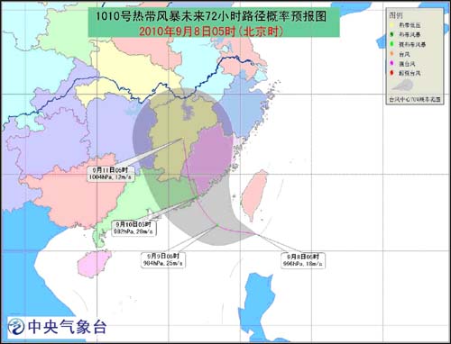 預(yù)計,風(fēng)暴中心將先以每小時10-15公里的速度向偏西方向移動,將于8日傍晚前后進入南海東北部海面,以后逐漸轉(zhuǎn)向西北方向移動,并向廣東東部到福建南部一帶沿?拷,強度逐漸加強,將于9日夜間到10日上午在這一帶沿海登陸。