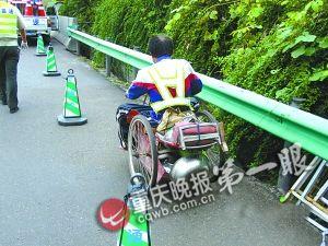 原來,10日晨8時15分左右,一名司機向六大隊報警說,臨近渝黔高速公路東溪段往貴州方向的天平丘隧道,他發(fā)現(xiàn)所有車突然慢下來——原來,路上有個穿反光背心的殘疾中年男子,正吃力駕駛1輛手搖三輪車緩行。駛?cè)刖徤掀虏痪茫凶永鄣脻M頭大汗,索性下車手撐三輪車尾,用幾乎半跪半爬方式推車。