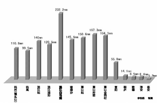 杭州的最大降雨出現(xiàn)在濱江的白馬湖站,3小時內(nèi)就下了218.9mm,達到了大暴雨級別。