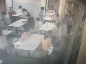 監(jiān)控室位于醫(yī)院精神康復(fù)中心旁邊的一棟三層小樓內(nèi)。記者來(lái)到那里時(shí),朱金紅所在位置的影像已被接到一臺(tái)電腦的屏幕上。王麗娟告訴記者,那是康復(fù)中心的食堂,病人們剛剛吃晚飯,有的坐著閑聊,有的已經(jīng)離開(kāi)了!爸旖鸺t剛走了,快,打電話讓護(hù)士把她叫回來(lái)!蓖觖惥赀@樣吩咐辦公室那位工作人員。