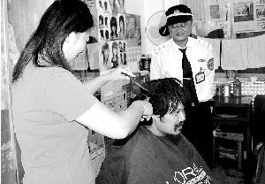 巡防隊員帶“看車哥”到理發(fā)店理發(fā)。