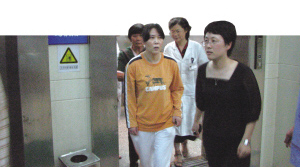電梯上的數(shù)字從“5”開(kāi)始下降,那里,就是朱金紅所住的病房。所有人,都在等待那個(gè)讓人牽掛的身影出現(xiàn)。傍晚6時(shí)15分左右,在醫(yī)院副院長(zhǎng)王麗娟的陪同下,朱金紅走下電梯。依然是橘紅色的上衣、白色運(yùn)動(dòng)褲、馬尾辮,臉色蒼白如紙。不知有意還是無(wú)意,朱金紅躲開(kāi)母親徑直走出病房大樓。在即將上車(chē)那一刻,唐美蘭才將女兒扶進(jìn)車(chē),自己則坐在了女兒身邊。