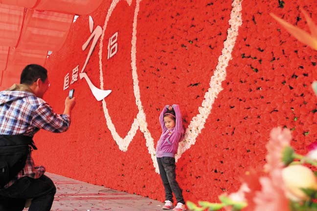 記者看到,酒店外近二十米長(zhǎng)的墻壁上密密麻麻插滿絹制玫瑰,花叢中還有“恒愛(ài)之侶”的字樣以及兩個(gè)靠在一起的心形裝飾。