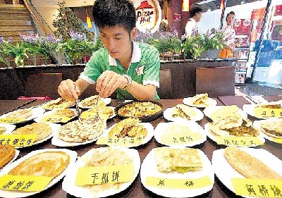 面對數(shù)十種不同的餅,“燒餅帥哥”有點拿不定主意。