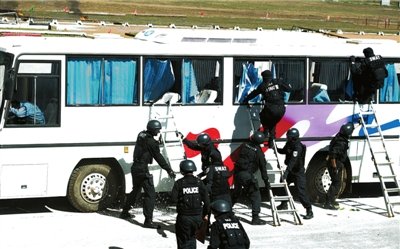 昨天上午,在京郊懷柔某訓(xùn)練場內(nèi),市公安局巡特警總隊首次聯(lián)合武警特警舉行反恐處突聯(lián)合實戰(zhàn)演練,北京特警精銳“藍(lán)劍突擊隊”和北京武警總隊國家級反恐力量“雪豹突擊隊”同時亮相。演練中共出動特警隊員400余人,大量反恐特種裝備同時亮相。警方還特別針對菲律賓武裝劫持大巴車事件進(jìn)行了反劫持演練。
