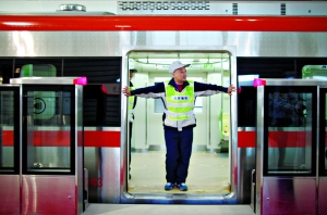 昨日,地鐵房山線,車站工作人員正準(zhǔn)備上車試運(yùn)行。記者 韓萌 攝