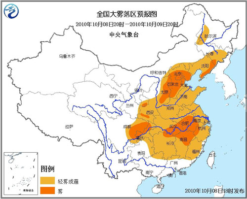 8日,中國(guó)河北、遼寧、安徽、江蘇、河南、湖北、江西、浙江等多地遭遇大霧天氣,大霧影響面積達(dá)9.6萬(wàn)平方公里。中央氣象臺(tái)8日晚間發(fā)布大霧藍(lán)色預(yù)警。預(yù)計(jì)9日上午,中國(guó)山西、河北、京津、遼寧、四川、重慶、湖北、安徽、江西、浙江等11省區(qū)的部分地區(qū)將再遭大霧籠罩。