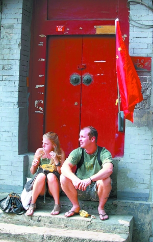 10月4日,一對(duì)外國情侶在南鑼鼓巷一個(gè)掛著國旗的小院門口邊吃小吃邊欣賞胡同風(fēng)情。 本報(bào)特約攝影 羅偉
