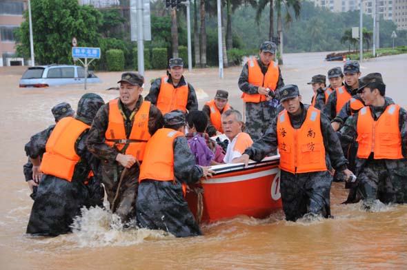 連日暴雨使海南文昌市區(qū)一片汪洋,海南省軍區(qū)官兵出動千余官兵奮力救災。圖為官兵從洪水中轉移被困群眾。肖雙劍 攝