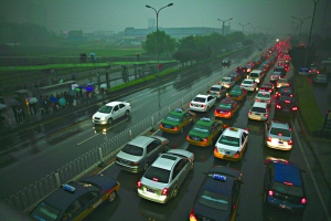 昨日,中關(guān)村東路,雨霧的天氣,交通非常擁堵。記者 浦峰 攝