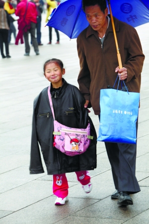 昨日,天安門(mén)廣場(chǎng),一名游客脫下自己的皮夾克給孩子穿上。本報(bào)記者 周曉東 攝