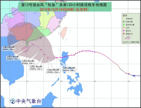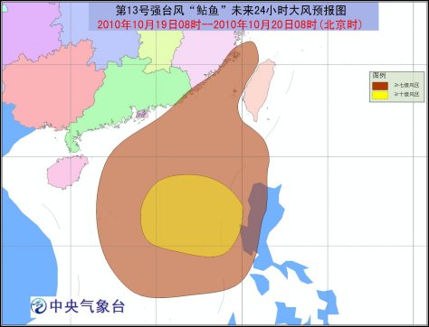 今年第13號(hào)超強(qiáng)臺(tái)風(fēng)“鲇魚(yú)”已于10月18日20時(shí)在菲律賓呂宋島北部減弱為強(qiáng)臺(tái)風(fēng),18日22時(shí)前后進(jìn)入南海東部海面。19日05時(shí)強(qiáng)臺(tái)風(fēng)“鲇魚(yú)”的中心位于南海東部海面上,就是北緯16.8度,東經(jīng)118.8度,中心附近最大風(fēng)力有15級(jí)(50米/秒),中心最低氣壓為945百帕。