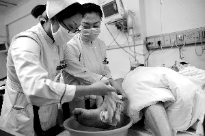 昨日,宣武醫(yī)院,護(hù)士在護(hù)理病人。今年3月,宣武醫(yī)院成為首批“優(yōu)質(zhì)護(hù)理服務(wù)示范工程”試點(diǎn)醫(yī)院。記者 王申 攝