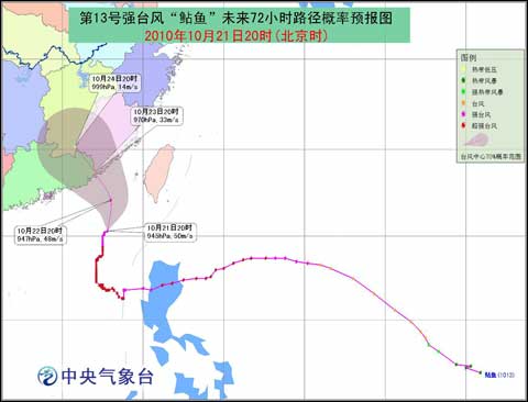 今年第13號(hào)強(qiáng)臺(tái)風(fēng)"鲇魚"的中心10月21日18時(shí)位于廣東省惠來縣南偏東約330公里的南海北部海面上,就是北緯20.1度,東經(jīng)117.6度,中心附近最大風(fēng)力有15級(jí)(50米/秒),最低氣壓為945百帕。