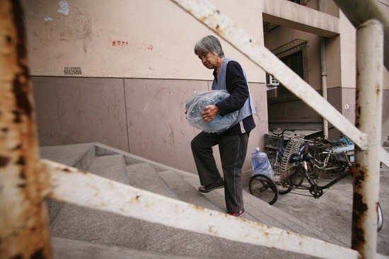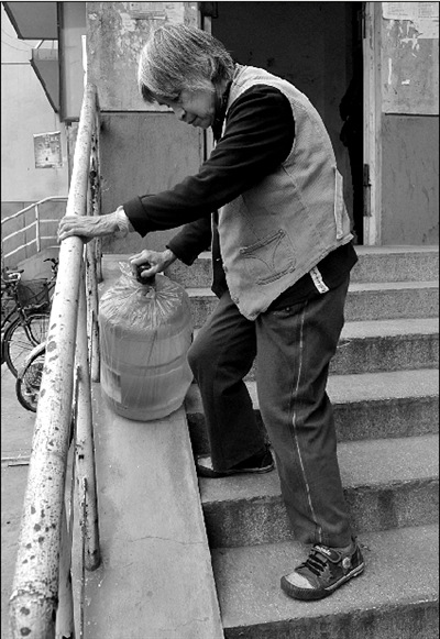 因?yàn)橥疤,老太太將水桶順著樓梯的斜坡滑下?lái)。記者 胡雪柏 攝