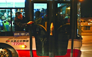 阿蘭(化名)是六里橋北里附近一名交通協(xié)管員,從2007年開始,她就在這里負(fù)責(zé)維持交通秩序。揮動小旗,右手推著乘客的背,配合著關(guān)門的節(jié)奏,順勢將乘客推上公交車。三年來,阿蘭每天早晨都要不停地重復(fù)這套動作,尤其是對擠300路、323路和661路車的乘客。