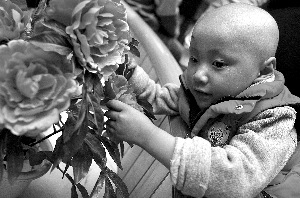 幾近失明的宏璇用手摸索著花壇里的花。昨日,患有視網(wǎng)膜母細(xì)胞瘤的宏璇住進(jìn)了武警總醫(yī)院。記者 吳江 攝