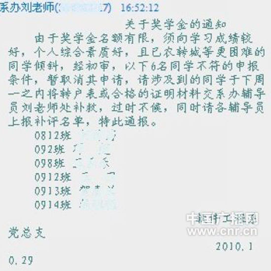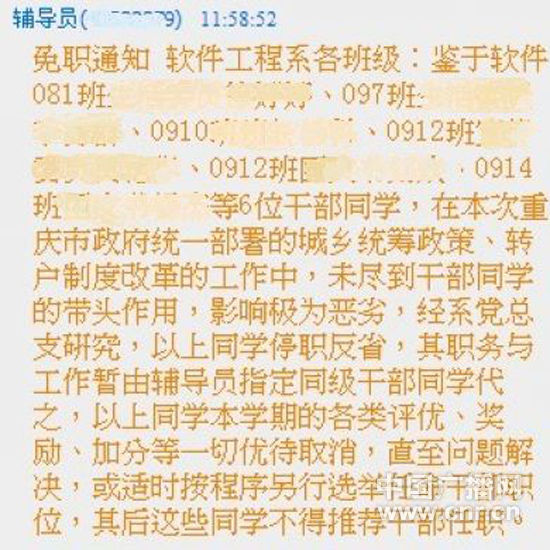 重慶科技學(xué)院一學(xué)生表示,從今年9月份開學(xué)起,他所在的班級輔導(dǎo)員就開始頻繁與農(nóng)村戶口的大學(xué)生“交流”,其中9月份的“交流”就達(dá)4次,相當(dāng)于他所在班級上一學(xué)年所開班會次數(shù)的總和。