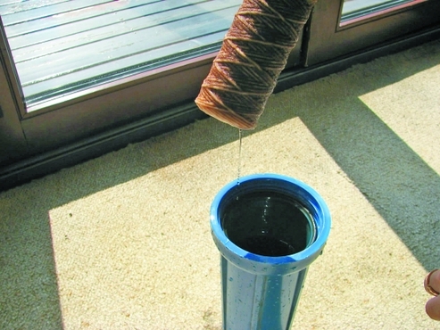 “這水簡直不能用,所以我們裝了凈水過濾器!彼闻繌募抑械目偹y口拆下一個塑料裝置,這就是水質(zhì)過濾器。打開過濾器,吳華抽出了一根已經(jīng)變成黃褐色的過濾棒。“我們這里幾乎家家戶戶都安裝了這種過濾器,這種過濾棒原本是白色的,新?lián)Q的不到一周時間就變成這樣了!