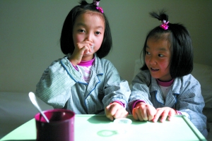 昨日,在病房內(nèi),8歲的小姐妹雖然有些靦腆,但還是露出微笑。大大的眼睛、白皙的皮膚,很難看出是腦癱患兒。媽媽吳偉說:“她們的進(jìn)步是我堅(jiān)持8年的動力。”