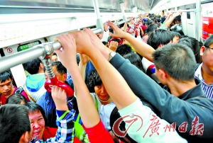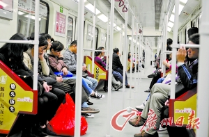 、4日的體育西路站,車廂內(nèi)的乘客擁擠不堪。記者喬軍偉攝