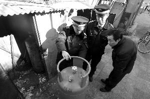 西城城管監(jiān)察大隊隊員正在對一家餐館的煤氣罐進行檢查。這是城管第一次涉及燃氣檢查。資料圖片 楊杰 攝
