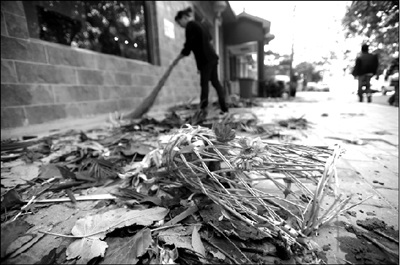 大量鮮花殘骸散落,店內(nèi)的服務(wù)員正在清掃。本報記者 潘之望 攝