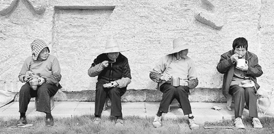 10月27日,在浙江嘉興市區(qū)某廣場上,一群在周邊社區(qū)打工的農(nóng)民工正抓緊時間吃午餐。儲永志攝(人民圖片)