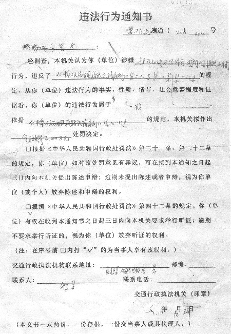 在這所農(nóng)家小院,穿制服的人告訴他,他的車沒有辦營(yíng)運(yùn)許可證,違反了《道路運(yùn)輸條例》,并開具了違法行為通知書和車輛暫扣證。嚴(yán)師傅看到罰款欄里的“30000萬(wàn)元”大吃一驚。他以車屬公司自用車為由拒絕在通知書上簽字。雙方爭(zhēng)執(zhí)不下。嚴(yán)師傅決定去法院告他們。他拿上通知書和暫扣證,假裝去尉氏縣找人說情,坐上一輛三輪車來到了縣城,用彩色復(fù)印機(jī)復(fù)印了通知書和暫扣證,以備將來使用。
