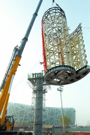 據(jù)介紹,北京奧運(yùn)會(huì)后,火炬一直“臥倒”在鳥巢頂部。9月初,它被運(yùn)往通州一家工廠“瘦身”。經(jīng)過近兩個(gè)月的翻新、加固,奧運(yùn)主火炬昨天上午在鳥巢北側(cè)熱身場(chǎng)旁開始吊裝。首先吊裝的是火炬頂部,一根16.8米高的鋼鐵脊柱早已扎根于火炬廣場(chǎng),這是火炬的“芯”,吊車將火炬頂部送到脊柱上方,通過基座緊密相連。