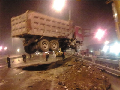 事故車為北京航程車隊的大貨車,昨天凌晨運渣土到大興。凌晨1點多,兩輛大貨一前一后來到新興橋引橋路段。