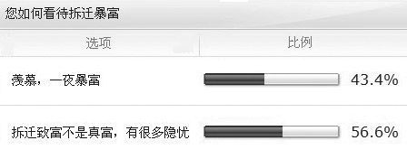 但是,新浪網(wǎng)針對(duì)“拆遷暴富”進(jìn)行的一項(xiàng)網(wǎng)友投票卻顯示,56.6%的人認(rèn)為“拆遷致富不是真富,有很多隱憂”。