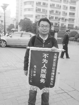 資料圖:周力在無錫市中心三陽百盛附近舉著錦旗。