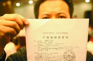 11月24日,平安府酒店,陳華(化名)的丈夫手拿尸檢知情同意書。本報記者 王申 攝