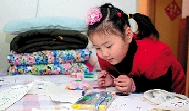 丁莎莎趴在她的小床上畫畫。新華社發(fā)