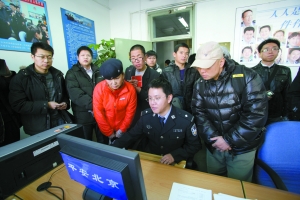 昨日,網(wǎng)友參觀“平安北京”博客工作站,與民警交流。 通訊員 張巖 攝