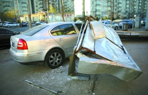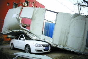 昨日,西三旗一處地鐵工地的一簡(jiǎn)易房被大風(fēng)吹到隔壁小區(qū)砸中一輛車(chē)。當(dāng)日,北京刮起8級(jí)大風(fēng)。記者 浦峰 攝