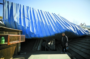 昨日,孫河上辛堡村,一戶自建彩鋼棚被前夜大風(fēng)吹飛,掉在鄰家屋頂。本報(bào)記者 浦峰 攝
