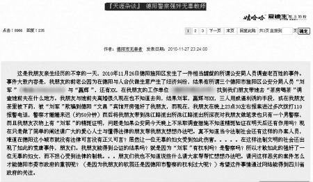 27日晚上11:24分許,在某門戶網(wǎng)站論壇上,一名為“德陽市無辜者”的網(wǎng)友發(fā)出一篇名叫“德陽警察強奸無辜教師”的帖子,引起網(wǎng)友熱議。