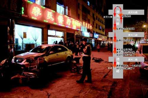 在黃河三路以南的大觀園商場(chǎng)附近,劉某又將騎自行車的女子姜某撞傷。在繼續(xù)向南逃竄的過程中,劉某將騎乘電動(dòng)車的賈某、商某母女倆撞飛,轎車拖著電動(dòng)車向南行至黃河二路以南時(shí),又撞上兩輛轎車及一輛摩托車,最后停在一家飯店門口,其間還將路邊的行人程某撞傷。