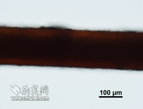 物鏡20倍下的馬尾毛,能隱約看到毛腔,腔壁厚實(shí),過度不明顯,外表粗糙,鱗片翹起很多,曾有專家認(rèn)定不明動(dòng)物毛發(fā)就是這種毛發(fā)