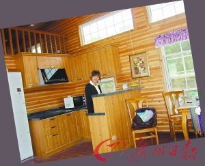 記者看到,所謂“移動(dòng)房屋”就是一間用木材搭建的木屋,面積大約40平方米,外形與電視上常見的外國郊野村屋沒有兩樣!耙苿(dòng)房屋”有三個(gè)款式,包括小公寓、酒吧、小餐館。其中小公寓為兩房一廳戶型,客廳、飯廳、酒吧臺、廚房、洗手間、主人房、客房配備完善,家電家具一應(yīng)俱全。
