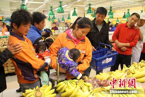 6日,江蘇常州的一超市內(nèi),來(lái)了三個(gè)身穿唐裝的特殊“顧客”。當(dāng)他們自顧的在超市內(nèi)采購(gòu)自己喜歡的水果時(shí),場(chǎng)內(nèi)的其它顧客才發(fā)現(xiàn),原來(lái)是三只小猩猩。