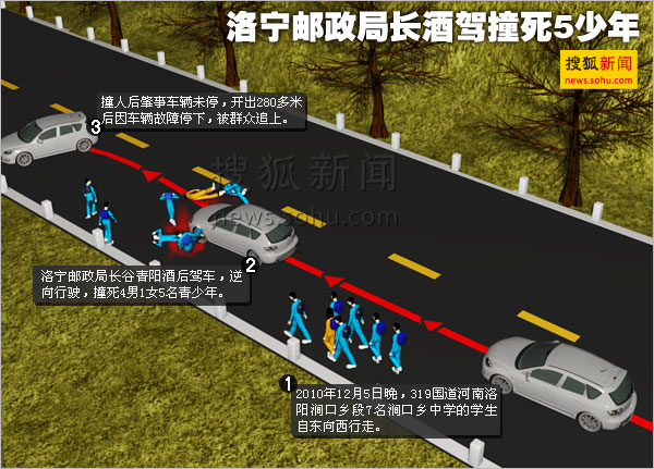 據(jù)通報(bào),12月5日23時(shí)30分許,洛陽市洛寧縣郵政局局長谷青陽,酒后駕駛黑色帕薩特牌轎車,沿S319省道(安虎線)由東向西行至79公里處(洛寧縣澗口鄉(xiāng)東村路段),逆向行駛與道路南側(cè)多名行人相撞,造成洛寧縣澗口鄉(xiāng)中學(xué)3名初中生當(dāng)場(chǎng)死亡,澗口鄉(xiāng)2名青少年搶救無效死亡,并導(dǎo)致車輛損壞。