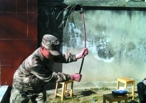 甘孜軍分區(qū)獨(dú)立營(yíng)戰(zhàn)士演示撲火過程。他使用的,就是當(dāng)?shù)氐闹饕獪缁鸸ぞ摺八芰贤习选薄?/P>