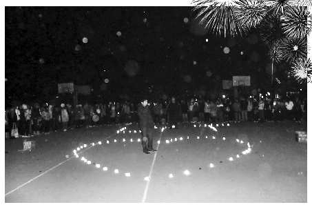 據(jù)該校大二女生蓓蓓(化名)回憶,當晚9點30分許,她正和舍友去操場健身,忽然聽到一群男生在大聲喊,好奇地過去一看,發(fā)現(xiàn)在一號女生宿舍前,有一二十名男生燃放煙火,向女生宿舍喊話。男生們還用酒精燈在小半個籃球場大的空地上,擺出“心”形。求愛“男主角”站在其中打電話。